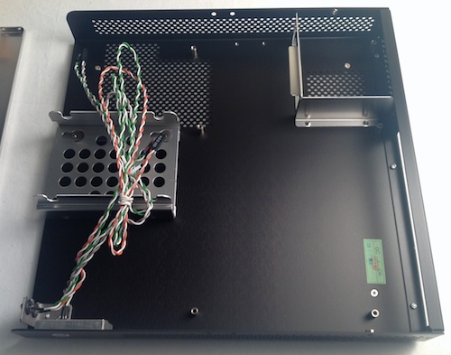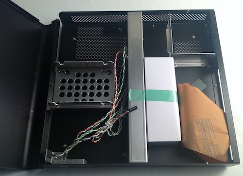 The Q05 is a rather simple case in that it features no USB or other ports in the case itself. The thin rectangle simply provides space to mount a Thin Mini-ITX board, two 2.5-inch drives (preferably SSDs), and the Intel HTS1155LP CPU cooler. Since the power supply is external, no space is needed for it either in the case.